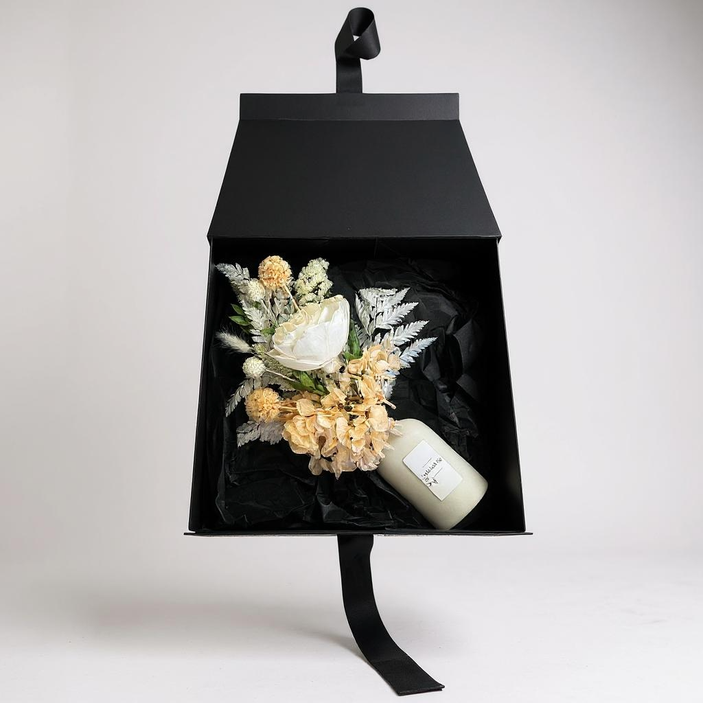 A handcrafted dried-flower arrangement, a candle of your choice, and a personalised card—at a reduced bundle price.